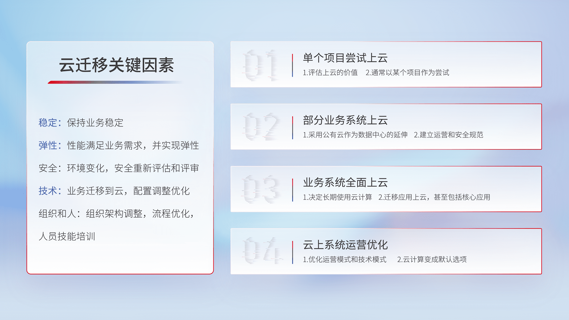 结合实际业务,,,,从规划设计、、云平台选型、、、云原生改造、、数据迁移、、、集成交付,,迁移全过程为客户识别最佳上云路径,,,,做好风险识别管理,,,设计网络架构、、、身份权限、、、安全审计合规、、操作审计、、日志审计、、、、监控告警策略、、、、多站点容灾设计等,,,对云上基础设施进行整体规划,,,提升IT治理水平,,,,以满足弹性、、、、高可用、、、高性能的需求。。。。
